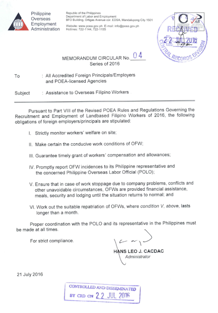 Sa mga kapwa ko OFW at sa mga mag aabroad, naglabas po ang Philippine Overseas Employment Agency (POEA) ng Memorandum Circulars Nos. 3 and 4 Series of 2016 para sa mga lisensyadong Recruitment Agencies na ang layunin ay subaybayan at bigyan ng pansin ang mga reklamo at hinaing ng kanilang mga deployed overseas Filipino workers.